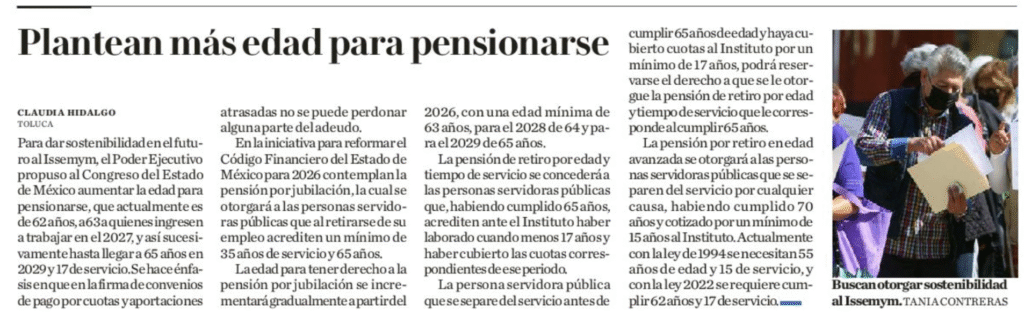 Para dar sostenibilidad en el futuro al Issemym, el Poder Ejecutivo propuso al Congreso del Estado de México aumentar la edad para pensionarse, que actualmente es de 62 años, a 63 a quienes ingresen a trabajar en el 2027, y así sucesivamente hasta llegar a 65 años en 2029 y 17 de servicio. Se hace énfasis en que en la firma de convenios de pago por cuotas y aportaciones atrasadas no se puede perdonar alguna parte del adeudo.