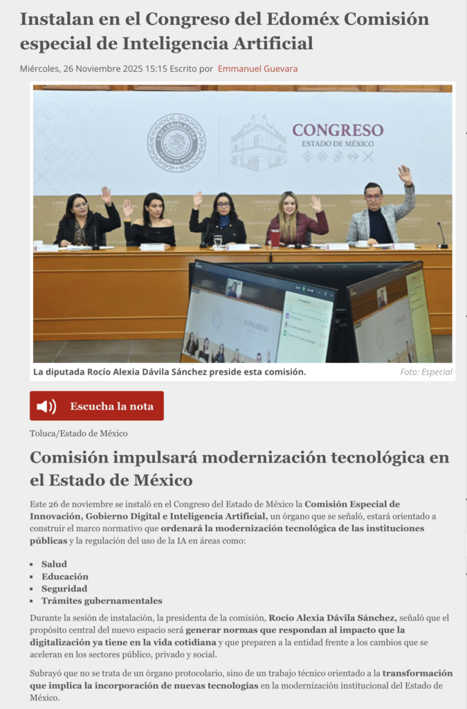 Este 26 de noviembre se instaló en el Congreso del Estado de México la Comisión Especial de Innovación, Gobierno Digital e Inteligencia Artificial, un órgano que se señaló, estará orientado a construir el marco normativo que ordenará la modernización tecnológica de las instituciones públicas y la regulación del uso de la IA
