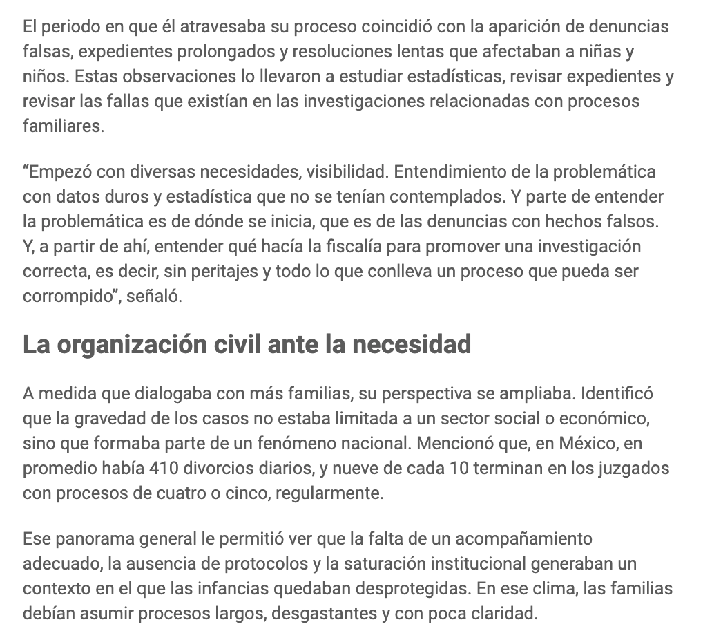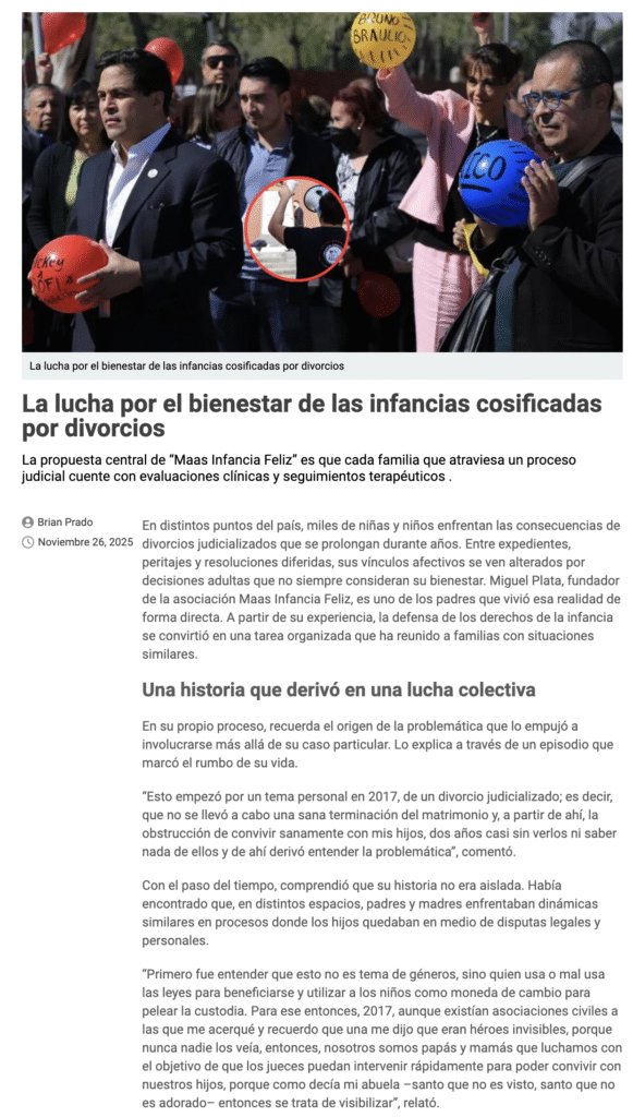 En distintos puntos del país, miles de niñas y niños enfrentan las consecuencias de divorcios judicializados que se prolongan durante años. Entre expedientes, peritajes y resoluciones diferidas, sus vínculos afectivos se ven alterados por decisiones adultas que no siempre consideran su bienestar. Miguel Plata, fundador de la asociación Maas Infancia Feliz, es uno de los padres que vivió esa realidad de forma directa. A partir de su experiencia, la defensa de los derechos de la infancia se convirtió en una tarea organizada que ha reunido a familias con situaciones similares.