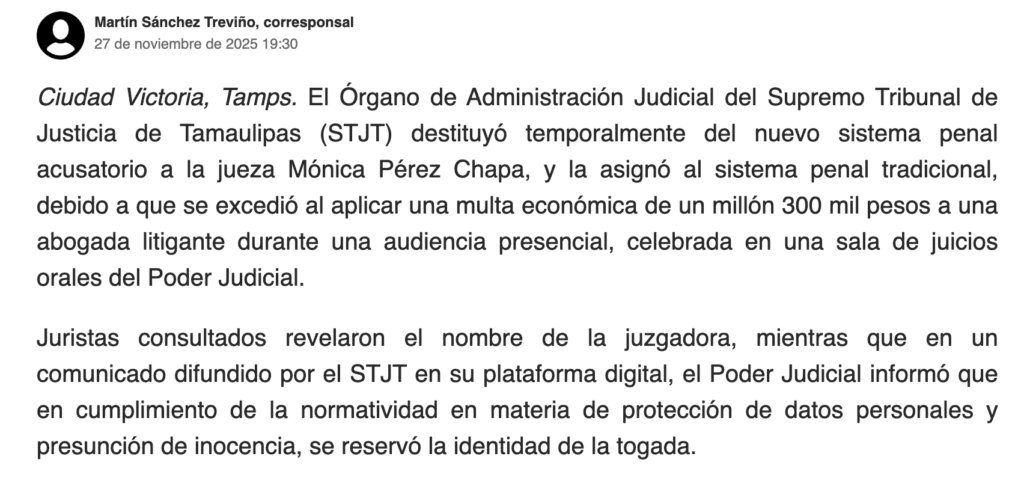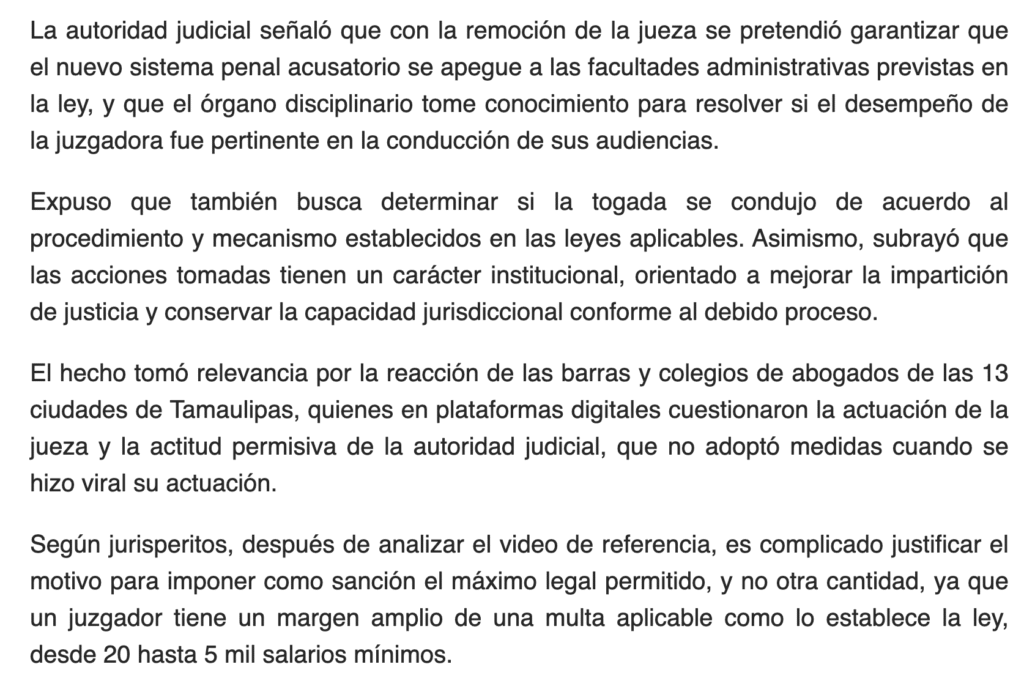 - https://www.jornada.com.mx/noticia/2025/11/27/estados/destituyen-a-jueza-de-tamaulipas-por-imponer-multa-excesiva-a-abogada-litigante