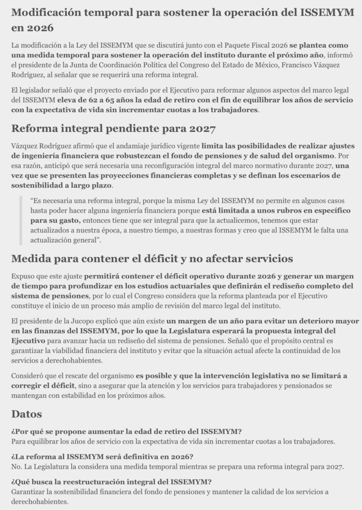 La modificación a la Ley del ISSEMYM que se discutirá junto con el Paquete Fiscal 2026 se plantea como una medida temporal para sostener la operación del instituto durante el próximo año, informó el presidente de la Junta de Coordinación Política del Congreso del Estado de México, Francisco Vázquez Rodríguez, al señalar que se requerirá una reforma integral.