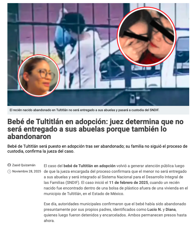 El caso del bebé de Tultitlán en adopción volvió a generar atención pública luego de que la jueza encargada del proceso confirmara que el menor no será entregado a sus abuelas y será integrado al Sistema Nacional para el Desarrollo Integral de las Familias (SNDIF). El caso inició el 11 de febrero de 2025, cuando un recién nacido fue encontrado dentro de una bolsa de plástico afuera de una vivienda en el municipio de Tultitlán, en el Estado de México.