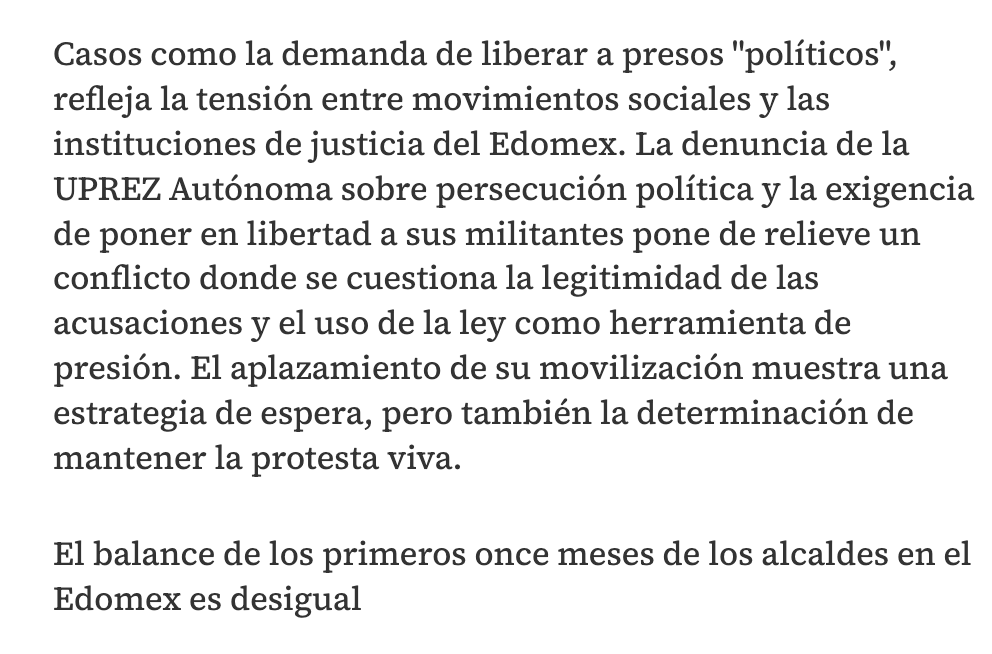 Casos como la demanda de liberar a presos “políticos”, refleja la tensión entre movimientos sociales y las instituciones de justicia del Edomex. La denuncia de la UPREZ Autónoma sobre persecución política y la exigencia de poner en libertad a sus militantes pone de relieve un conflicto donde se cuestiona la legitimidad de las acusaciones y el uso de la ley como herramienta de presión. El aplazamiento de su movilización muestra una estrategia de espera, pero también la determinación de mantener la protesta viva.