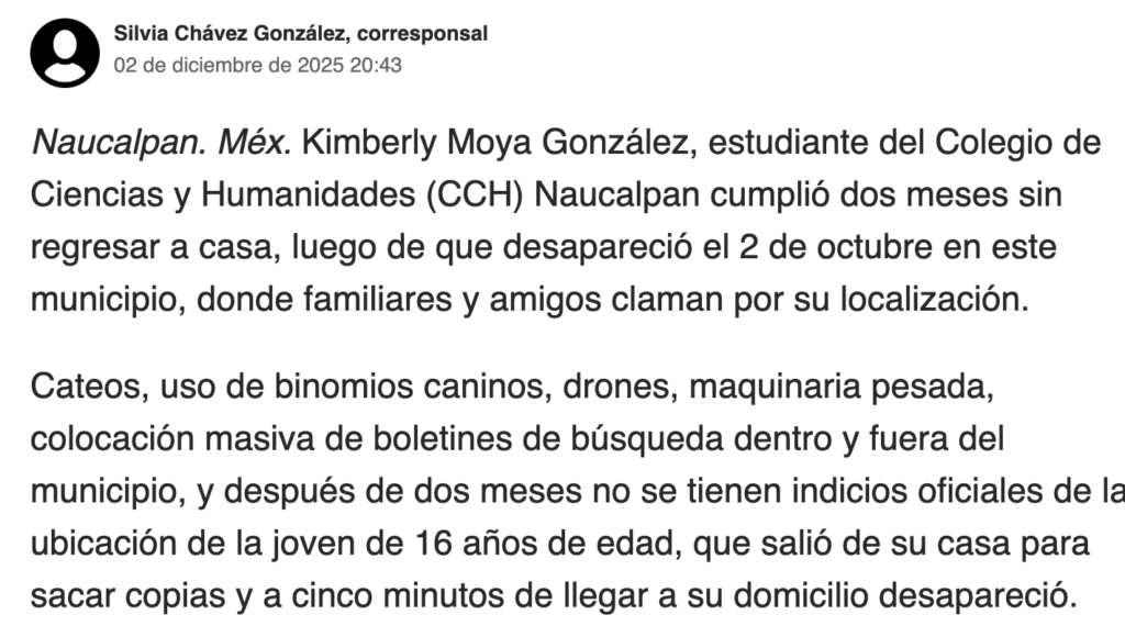 - https://www.jornada.com.mx/noticia/2025/12/02/estados/familiares-claman-por-la-aparicion-de-kimberly-moya-desaparecida-desde-octubre