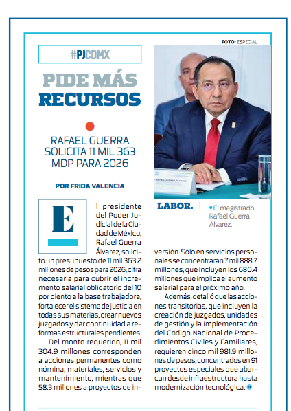 El presidente del Poder Judicial de la Ciudad de México, Rafael Guerra Álvarez, solicitó un presupuesto de 11 mil 363.2 millones de pesos para 2026, cifra necesaria para cubrir el incremento salarial obligatorio del 10 por ciento a la base trabajadora, fortalecer el sistema de justicia en todas sus materias, crear nuevos