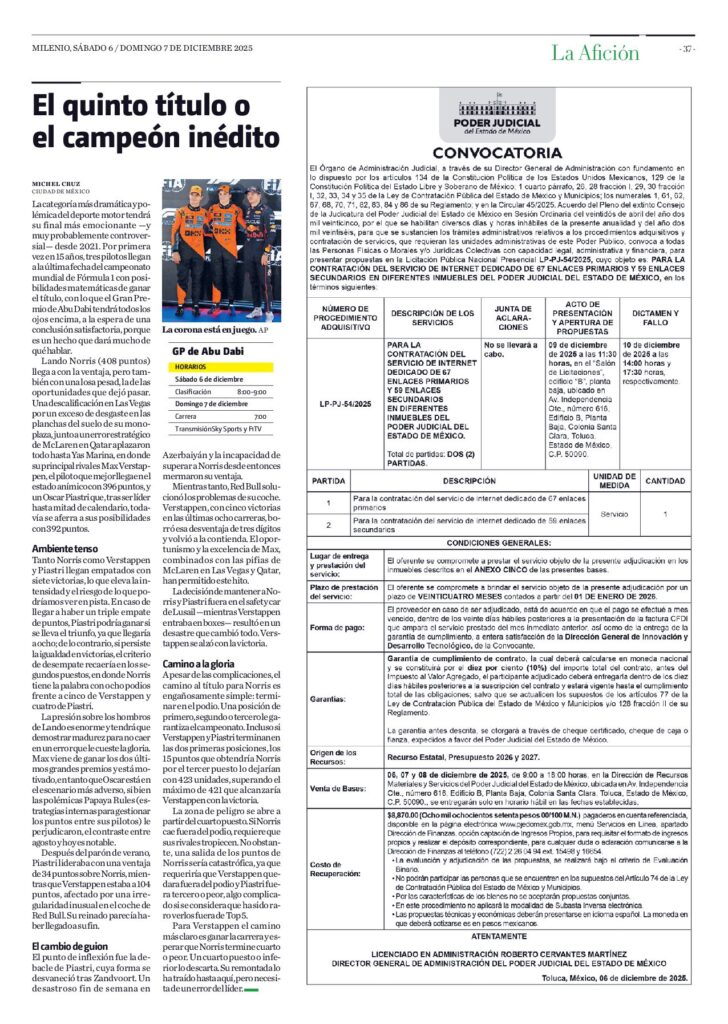 Convocatoria- Contratación del servicio de internet dedicado de 67 enlaces primarios y enlaces secundarios en diferentes inmuebles del Poder Judicial del Estado de México