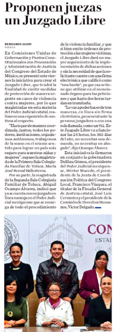 En Comisiones Unidades de Gobernación y Puntos Constitucionales con Procuración de Justicia del Congreso del Estado de México, se presentó este viernes la iniciativa para crear el Juzgado Libre, que tendrá la finalidad de emitir medidas de protección de manera urgente en casos de violencia contra mujeres, por lo que magistradas en esta materia del Poder Judicial estatal, realizaron una exposición de motivos al respecto.