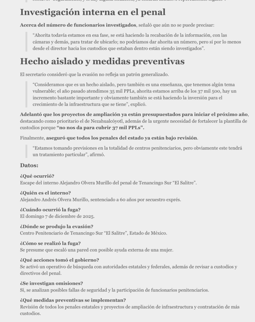 El secretario de Seguridad del Estado de México, Cristóbal Castañeda Camarillo, detalló este lunes los avances sobre la fuga de Alejandro Andrés Olvera Murillo, interno sentenciado a 60 años por secuestro exprés, quien escapó este domingo, 7 de diciembre, del Centro Penitenciario de Tenancingo Sur “El Salitre”, luego de no responder al pase de lista. El hombre había sido trasladado en febrero de este año desde el penal de Lerma.