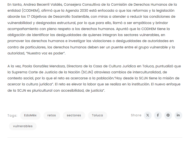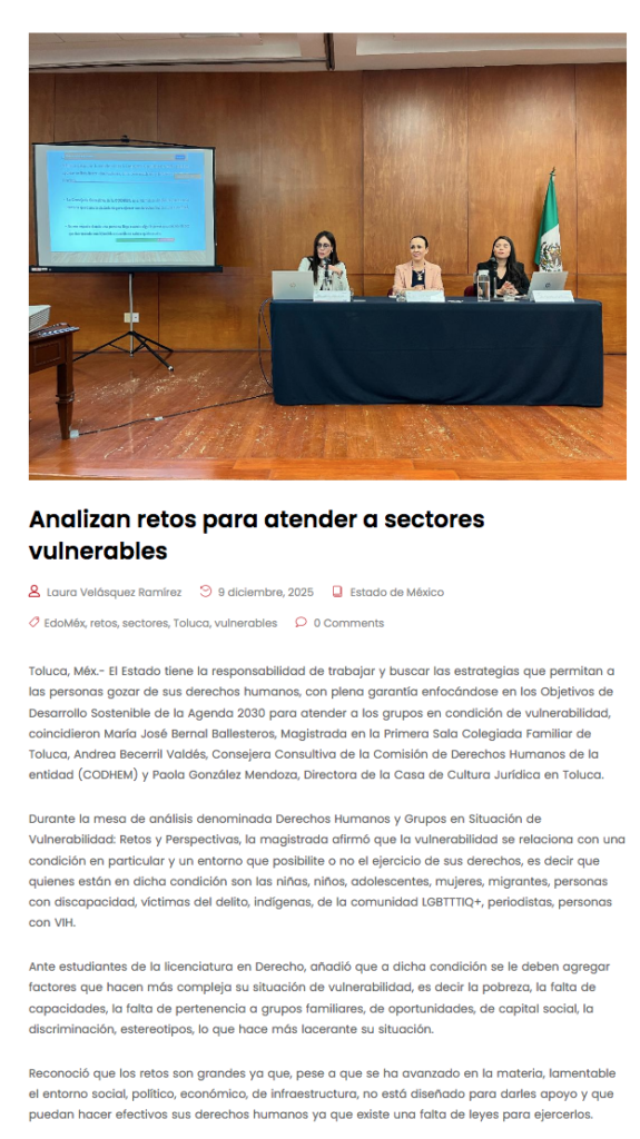 El Estado tiene la responsabilidad de trabajar y buscar las estrategias que permitan a las personas gozar de sus derechos humanos, con plena garantía enfocándose en los Objetivos de Desarrollo Sostenible de la Agenda 2030 para atender a los grupos en condición de vulnerabilidad, coincidieron María José Bernal Ballesteros, Magistrada en la Primera Sala Colegiada Familiar de Toluca, Andrea Becerril Valdés, Consejera Consultiva de la Comisión de Derechos Humanos de la entidad (CODHEM) y Paola González Mendoza, Directora de la Casa de Cultura Jurídica en Toluca.