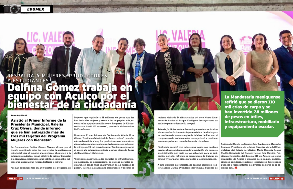 La Gobernadora Delfina Gómez Álvarez afirmó que el trabajo coordinado entre los tres niveles de gobierno es primordial para el impulso a las mujeres, al campo y a la educación en Aculco, con el objetivo de brindar bienestar a la ciudadanía mexiquense que habita en este pueblo mágico que alberga gran riqueza histórica y cultural.