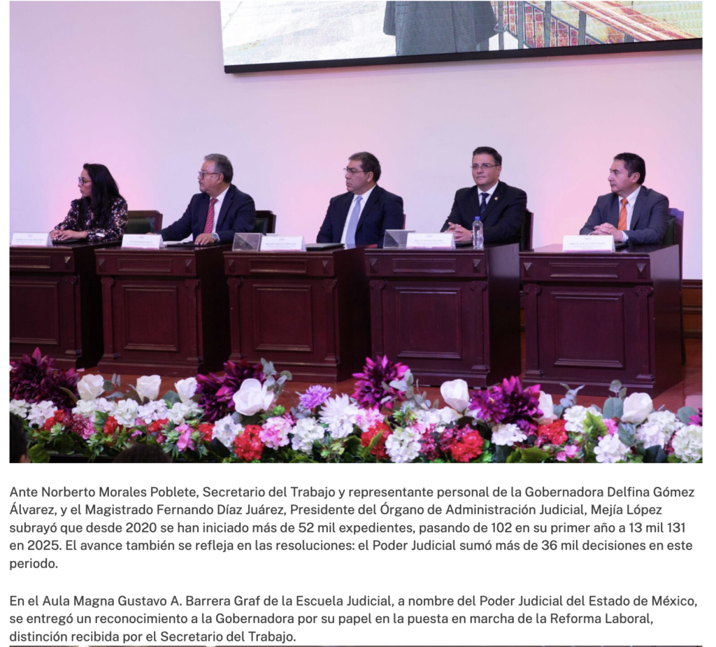 Ante Norberto Morales Poblete, Secretario del Trabajo y representante personal de la Gobernadora Delfina Gómez Álvarez y el Magistrado Fernando Díaz Juárez, Presidente del Órgano de Administración Judicial, Mejía López subrayó que desde 2020 se han iniciado más de 52 mil expedientes, pasando de 102 en su primer año a 13 mil 131 en 2025. El avance también se refleja en las resoluciones: el Poder Judicial sumó más de 36 mil decisiones en este periodo.