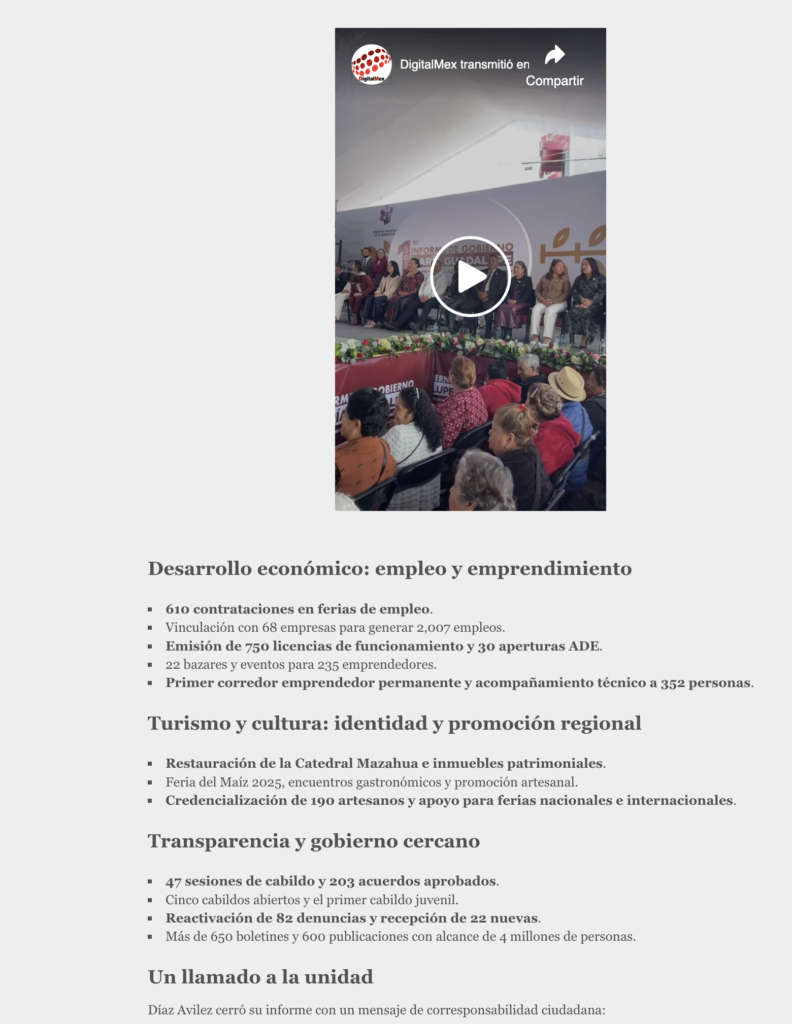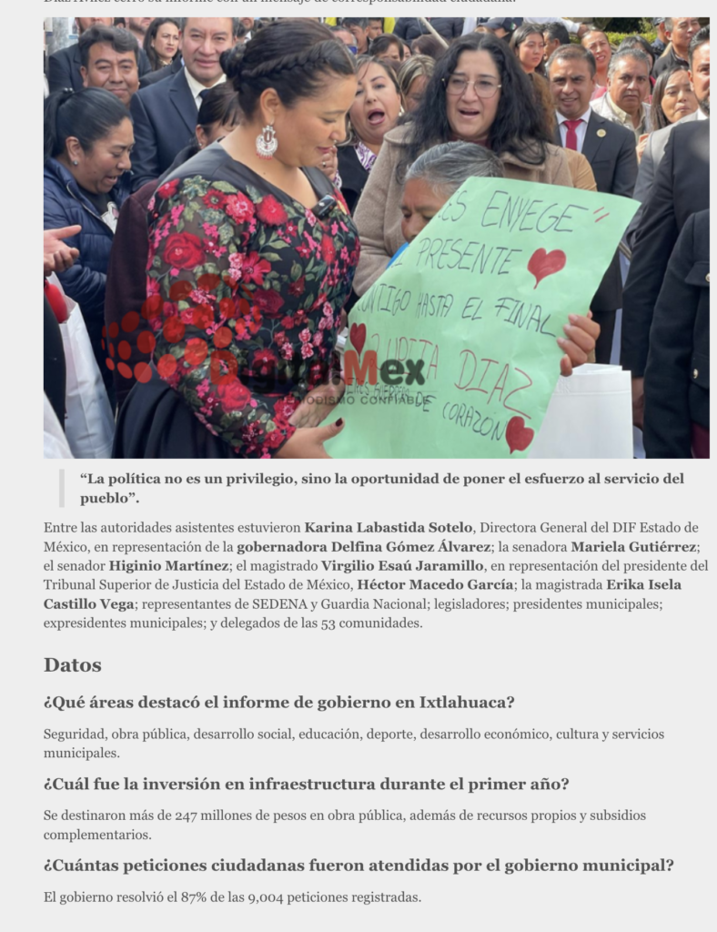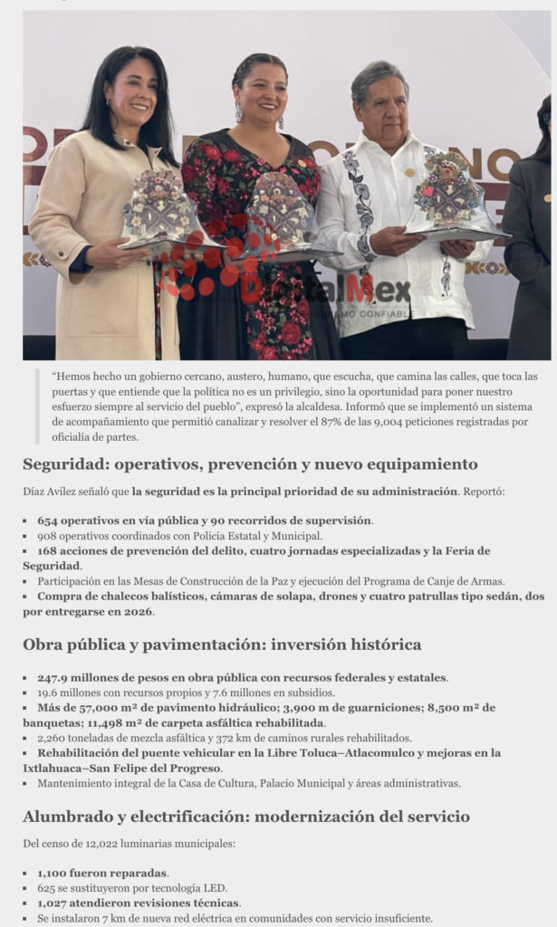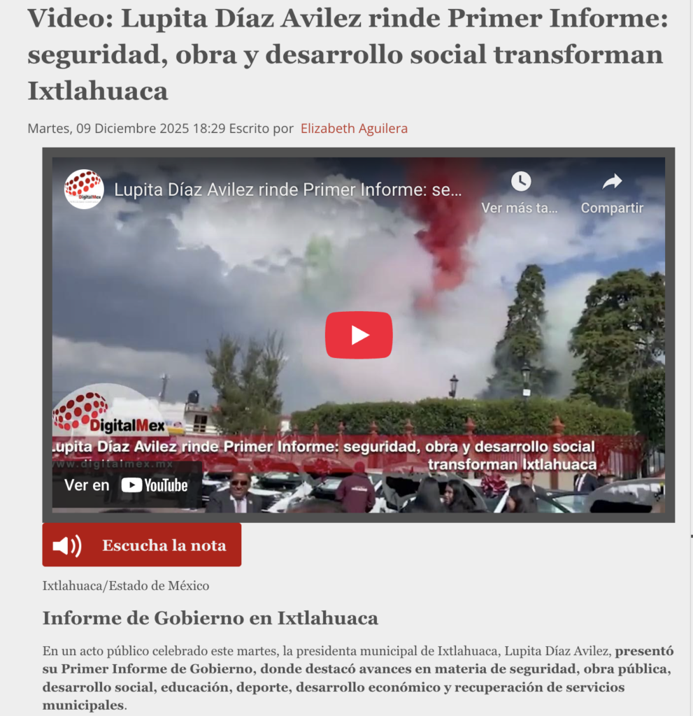 - https://digitalmex.mx/municipios/story/63559/video-lupita-diaz-avilez-rinde-primer-informe-seguridad-obra-desarrollo-social-transforman-ixtlahuaca