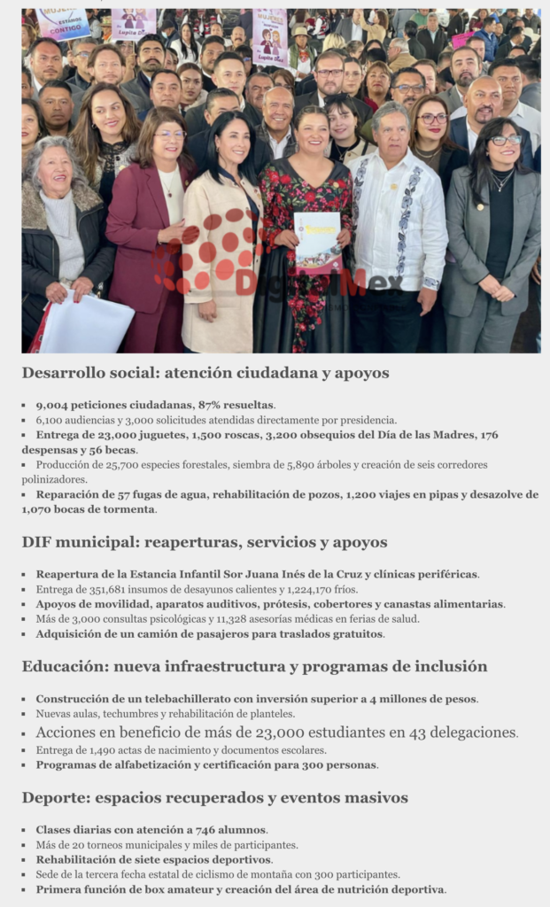 En un acto público celebrado este martes, la presidenta municipal de Ixtlahuaca, Lupita Díaz Avilez, presentó su Primer Informe de Gobierno, donde destacó avances en materia de seguridad, obra pública, desarrollo social, educación, deporte, desarrollo económico y recuperación de servicios municipales.