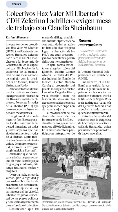 Colectivos Haz Valer Mi Libertad yCDH Zeferino Ladrillero exigen mesade trabajo con Claudia Sheinbaum
