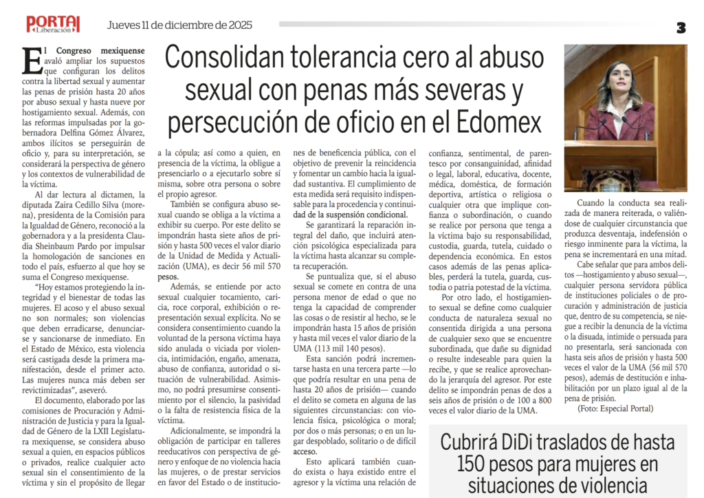 El Congreso mexiquense avaló ampliar los supuestos que configuran los delitos contra la libertad sexual y aumentar las penas de prisión hasta 20 años por abuso sexual y hasta nueve por hostigamiento sexual. Además, con las reformas impulsadas por la gobernadora Delfina Gómez Álvarez, ambos ilícitos se perseguirán de oficio y, para su interpretación, se considerará la perspectiva de género y los contextos de vulnerabilidad de la víctima.