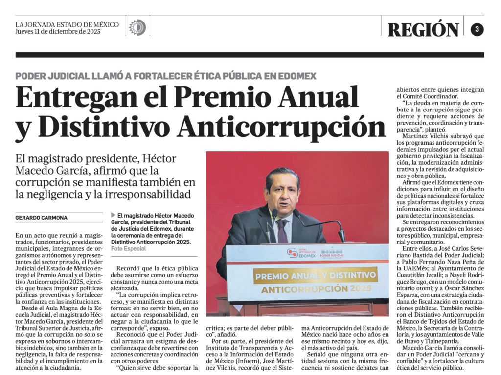 En un acto que reunió a magistrados, funcionarias, presidentes municipales, integrantes de organismos autónomos y representantes del sector privado, el Poder Judicial del Estado de México entregó el Premio Anual y el Distintivo Anticorrupción 2025, ejercicio que busca impulsar políticas públicas preventivas y fortalecer la confianza en las instituciones.