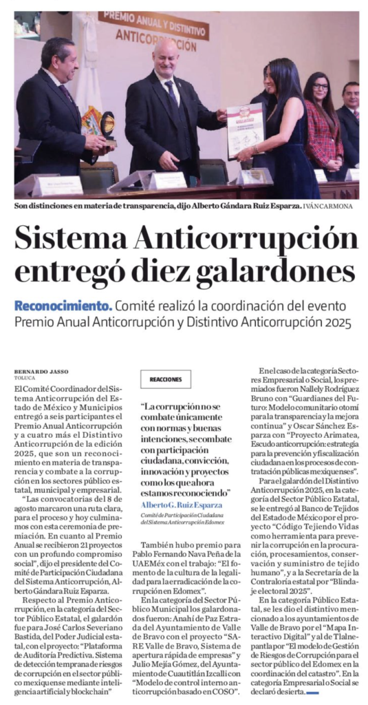 El Comité Coordinador del Sistema Anticorrupción del Estado de México y Municipios entregó a seis participantes el Premio Anual Anticorrupción y a cuatro más el Distintivo Anticorrupción de la edición 2025, que son un reconocimiento en materia de transparencia y combate a la corrupción en los sectores público estatal, municipal y empresarial