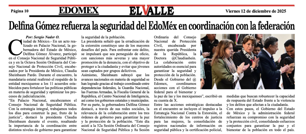 En un acto realizado en Palacio Nacional, la gobernadora del Estado de México, Delfina Gómez Álvarez, participó en el Consejo Nacional de Seguridad Pública y en la Octava Sesión Ordinaria del Consejo Nacional de Protección Civil, encabezados por la Presidenta de México, Claudia Sheinbaum Pardo. Durante el encuentro, la mandataria estatal reafirmó el respaldo de la entidad mexiquense a los 11 acuerdos establecidos para fortalecer las políticas públicas en materia de seguridad y optimizar los procesos de judicialización.