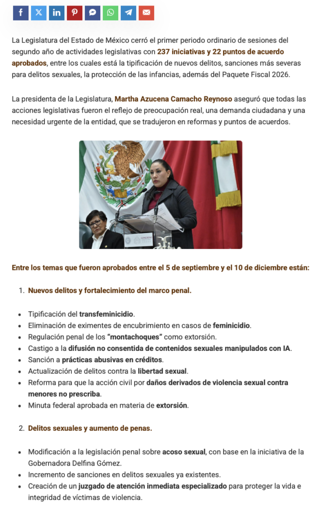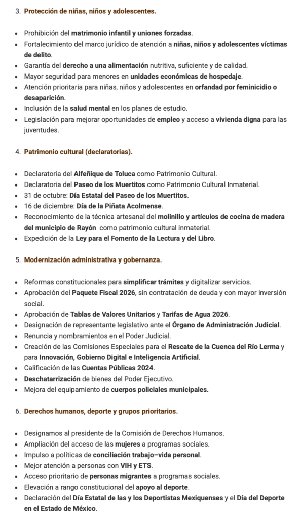 La Legislatura del Estado de México cerró el primer periodo ordinario de sesiones del segundo año de actividades legislativas con 237 iniciativas y 22 puntos de acuerdo aprobados, entre los cuales está la tipificación de nuevos delitos, sanciones más severas para delitos sexuales, la protección de las infancias, además del Paquete Fiscal 2026.