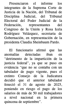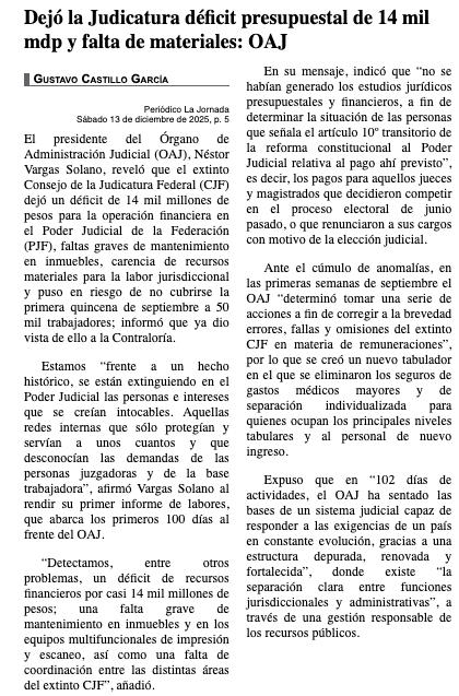 El presidente del Órgano de Administración Judicial (OAJ), Néstor Vargas Solano, reveló que el extinto Consejo de la Judicatura Federal (CJF) dejó un déficit de 14 mil millones de pesos para la operación financiera en el Poder Judicial de la Federación (PJF), faltas graves de mantenimiento en inmuebles, carencia de recursos materiales para la labor jurisdiccional y puso en riesgo de no cubrirse la primera quincena de septiembre a 50 mil trabajadores; informó que ya dio vista de ello a la Contraloría.
