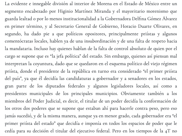 La evidente e innegable división al interior de Morena en el Estado de México entre un segmento encabezado por Higinio Martínez Miranda y el mayoritario morenismo que guarda lealtad o por lo menos institucionalidad a la Gobernadora Delfina Gómez Álvarez en primer término, y al Secretario General de Gobierno, Horacio Duarte Olivares, en segundo, ha dado pie a que políticos opositores, principalmente priístas y algunos comentócratas locales, hablen ya de una insubordinación y de una falta de respeto hacia la mandataria. Incluso hay quienes hablan de la falta de control absoluto de quien por el cargo se supone que es “la jefa política” del estado. Sin embargo, quienes así piensan mal interpretan la coyuntura, dado que se quedaron en el esquema político del viejo régimen priísta, donde el presidente de la república en turno era considerado “el primer priísta del país”, ya que él decidía las candidaturas a gobernador y a senadores en los estados, gran parte de los diputados federales y algunos legisladores locales, así como a presidentes municipales de los principales municipios. Obviamente también a los miembros del Poder Judicial, es decir, el titular de un poder decidía la conformación de los otros dos poderes que se supone que estaban ahí para hacerle contra peso, pero eso jamás sucedió, y de la misma manera, aunque ya en menor grado, cada gobernador era “el primer priísta del estado” que decidía e imponía en todos los espacios de poder que le cedía para su decisión el titular del ejecutivo federal.