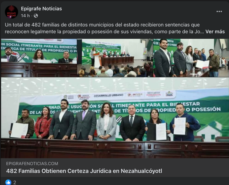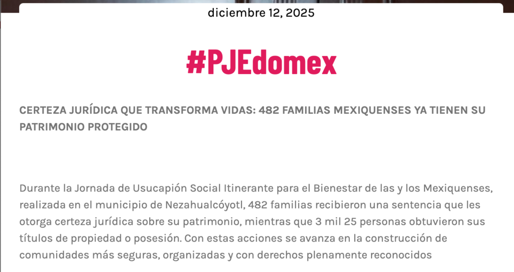 • https://ordenadorpolitico.com/2025/12/12/usucapion-social-itinerante-benefio-a-482-familias-mexiquenses/#:~:text=Nezahualc%C3%B3yotl%2C%20M%C3%A9xico%2C%2012%20de%20diciembre,certeza%20jur%C3%ADdica%20en%20su%20patrimonio.