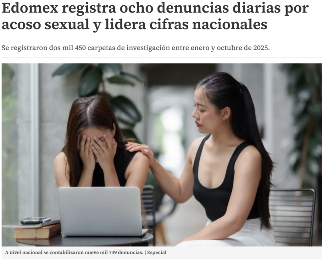 En la entidad del Estado de México se iniciaron más de dos mil 400 carpetas de investigación por acoso sexual entre enero y octubre de 2025; el promedio diario fue de ocho casos, cifra únicamente para aquellos que llegaron ante el Ministerio Público, según datos del Sistema Nacional de Seguridad Pública (SNSP).