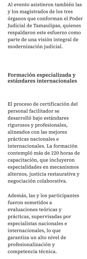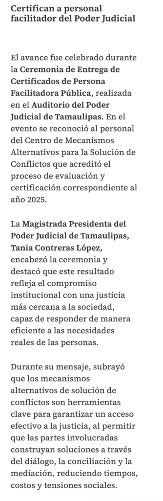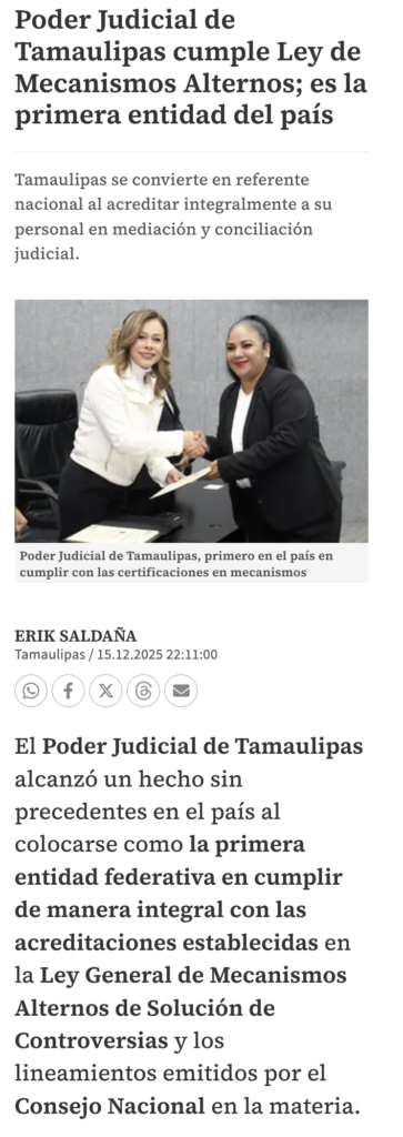El Poder Judicial de Tamaulipas alcanzó un hecho sin precedentes en el país al colocarse como la primera entidad federativa en cumplir de manera integral con las acreditaciones establecidas en la Ley General de Mecanismos Alternos de Solución de Controversias y los lineamientos emitidos por el Consejo Nacional en la materia.