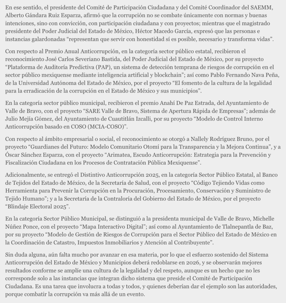 Con respecto al Premio Anual Anticorrupción, en la categoría sector público estatal, recibieron el reconocimiento José Carlos Severiano Bastida, del Poder Judicial del Estado de México, por su proyecto “Plataforma de Auditoría Predictiva (PAP), un sistema de detección temprana de riesgos de corrupción en el sector público mexiquense mediante inteligencia artificial y blockchain”; así como Pablo Fernando Nava Peña, de la Universidad Autónoma del Estado de México, por el proyecto “El fomento de la cultura de la legalidad para la erradicación de la corrupción en el Estado de México y sus municipios”.