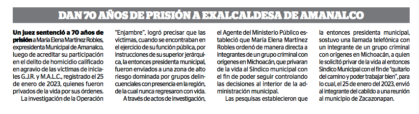 • https://oem.com.mx/la-prensa/policiaca/dan-70-anos-de-carcel-a-ex-alcaldesa-de-amanalco-por-delito-de-homicidio-27303794