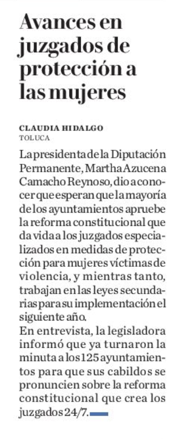 La presidenta de la Diputación Permanente, Martha Azucena Camacho Reynoso, dio a conocer que esperan que la mayoría de los ayuntamientos apruebe la reforma constitucional que da vida a los juzgados especializados en medidas de protección para mujeres víctimas de violencia.