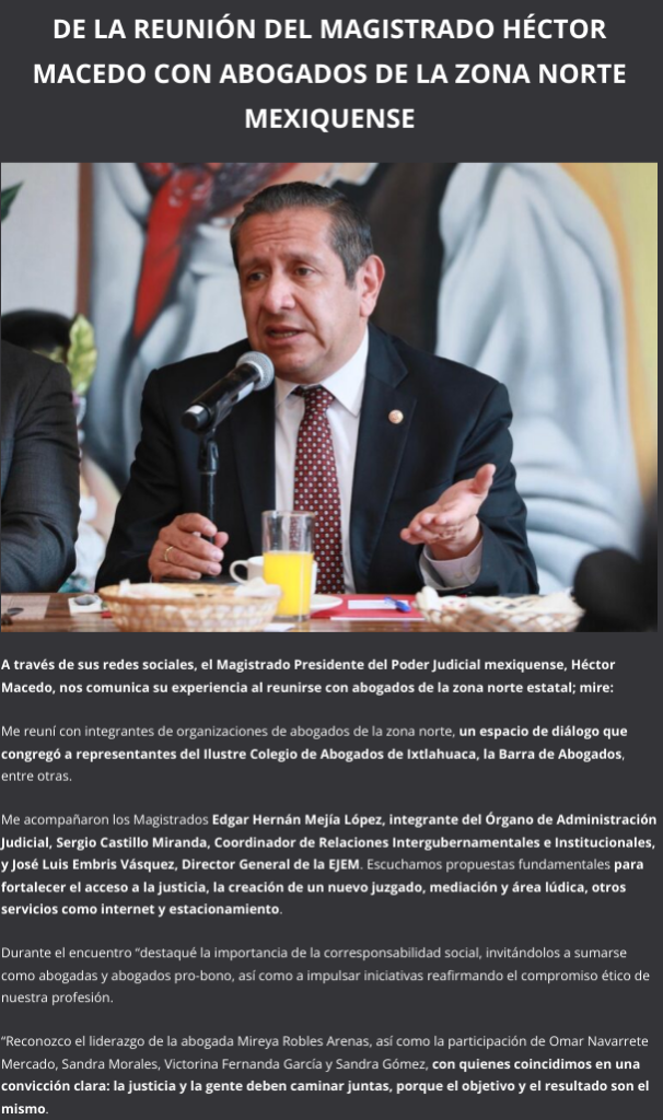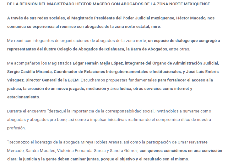 A través de sus redes sociales, el Magistrado Presidente del Poder Judicial mexiquense, Héctor Macedo, nos comunica su experiencia al reunirse con abogados de la zona norte estatal; mire: