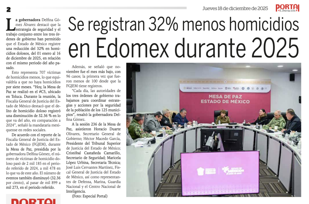 La gobernadora Delfina Gómez Álvarez destacó que la estrategia de seguridad y el trabajo conjunto entre los tres órdenes de gobierno han permitido que el Estado de México registre una reducción del 32% en homicidios dolosos, del 01 enero al 16 de diciembre de 2025, en relación con el mismo periodo del año pasado.