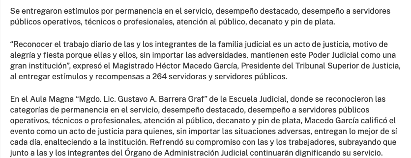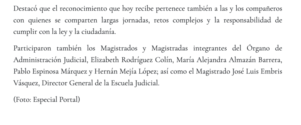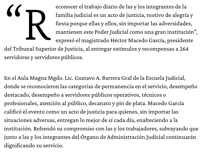 En el Aula Magna “Mgdo. Lic. Gustavo A. Barrera Graf” de la Escuela Judicial, donde se reconocieron las categorías de: permanencia en el servicio, desempeño destacado, desempeño a servidores públicos operativos, técnicos o profesionales, atención al público, decanato y pin de plata, Macedo García calificó el evento como un acto de justicia para quienes, sin importar las situaciones adversas entregan lo mejor de sí cada día, enalteciendo a la institución. Refrendó su compromiso con las y los trabajadores, subrayando que junto a las y los integrantes del Órgano de Administración Judicial continuarán dignificando su servicio.