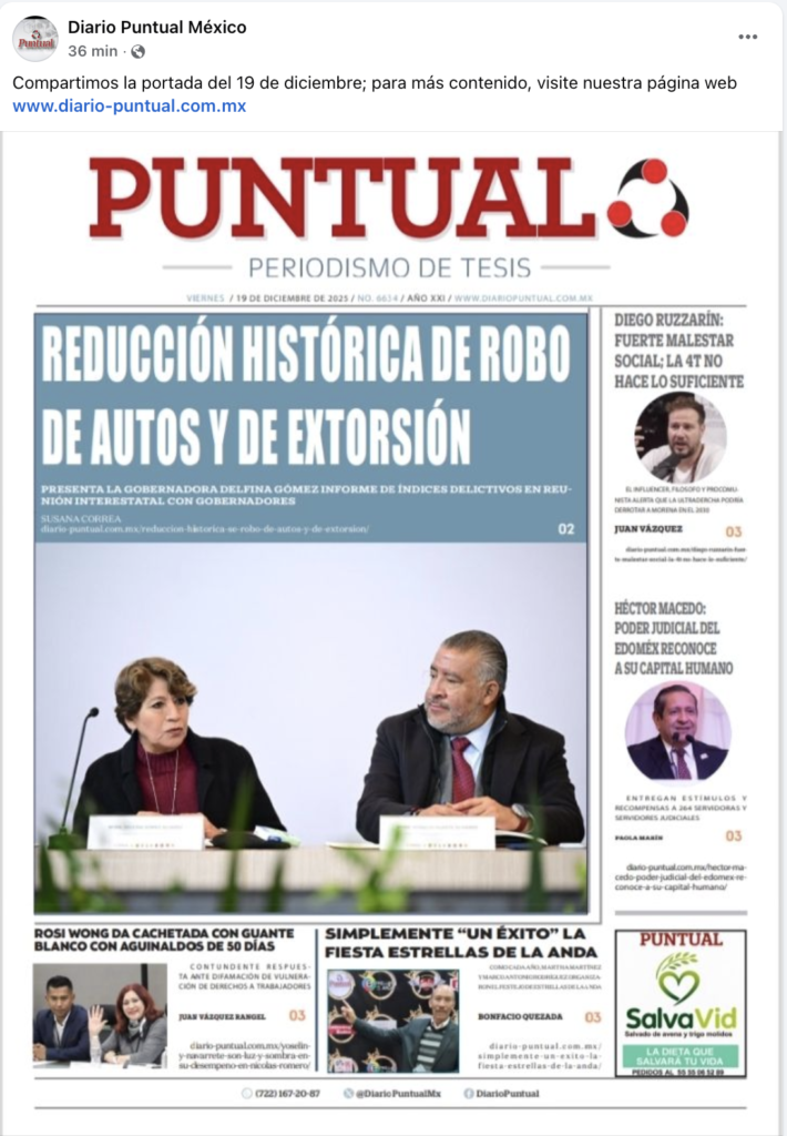 - https://www.facebook.com/DiarioPuntualMx/posts/pfbid0k2vDE91b7ZMH9qNTLeDKC4t9oQ3qafZ8b2kpjJN8yv6LUBcuPP756WPuYDLW9ePwl
