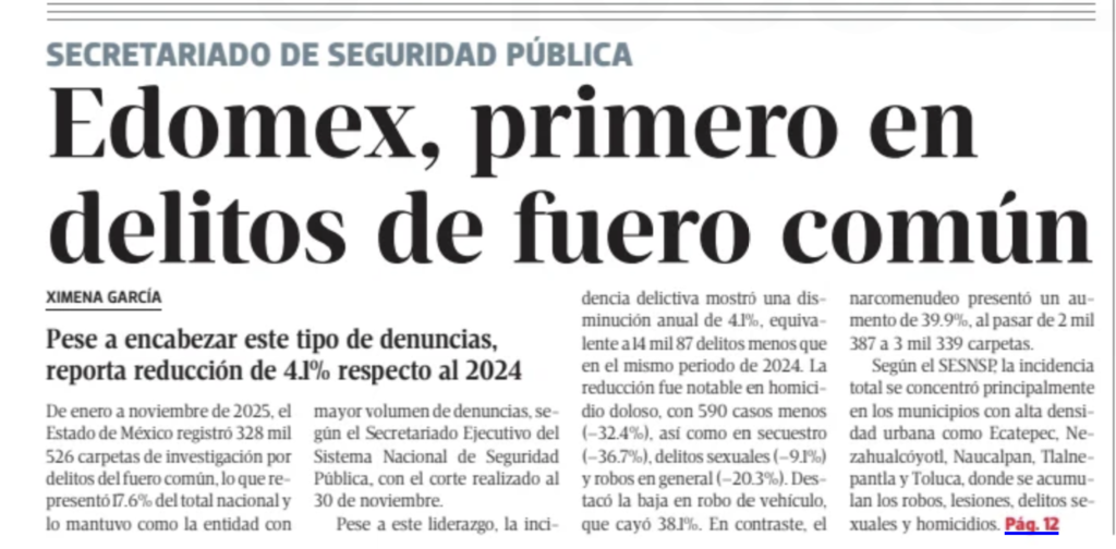 De enero a noviembre de 2025, el Estado de México registró 328 mil 526 carpetas de investigación por delitos del fuero común, lo que representó 17.6% del total nacional y lo mantuvo como la entidad con mayor volumen de denuncias, según el Secretariado Ejecutivo del Sistema Nacional de Seguridad Pública, con el corte realizado al 30 de noviembre.