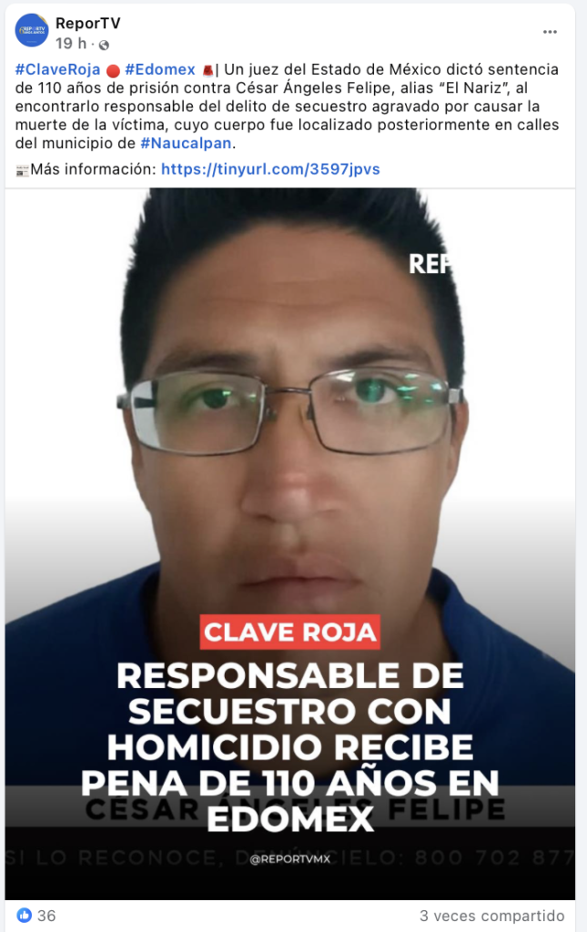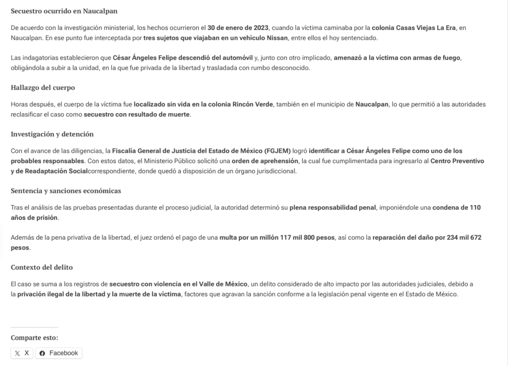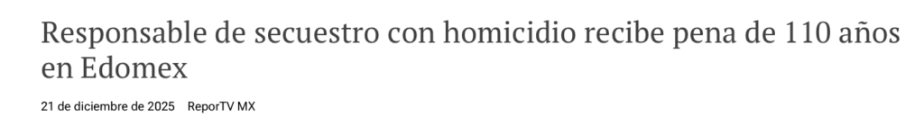 • https://reportv.com.mx/2025/12/21/responsable-de-secuestro-con-homicidio-recibe-pena-de-110-anos-en-edomex/?fbclid=IwY2xjawO2I61leHRuA2FlbQIxMABicmlkETFveW9MdkFrQ1lFOE1FRmlsc3J0YwZhcHBfaWQQMjIyMDM5MTc4ODIwMDg5MgABHhDHNHII3Olbi1jOmGqtgmn96_Qrs9Br3lAwEshtqSEXAn0cQUJ4icIExs_c_aem_I6Fq5iRpzRXR7xYhIbaF8g