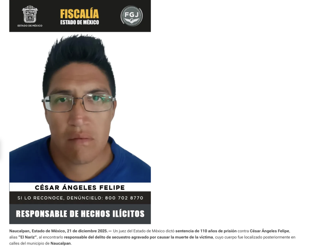 Un Juez del penal de Barrientos en Tlalnepantla, luego de analizar las pruebas presentadas por la Fiscalía General de Justicia del Estado de México, sentenció a una pena de 110 años de prisión a César Ángeles Felipe, alias El Nariz”, quien fue declarado culpable del delito de secuestro con la agravante de causar la muerte a la víctima.