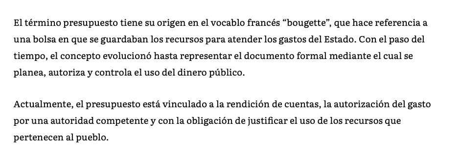 El término presupuesto tiene su origen en el vocablo francés “bougette”, que hace referencia a una bolsa en que se guardaban los recursos para atender los gastos del Estado. Con el paso del tiempo, el concepto evolucionó hasta representar el documento formal mediante el cual se planea, autoriza y controla el uso del dinero público.