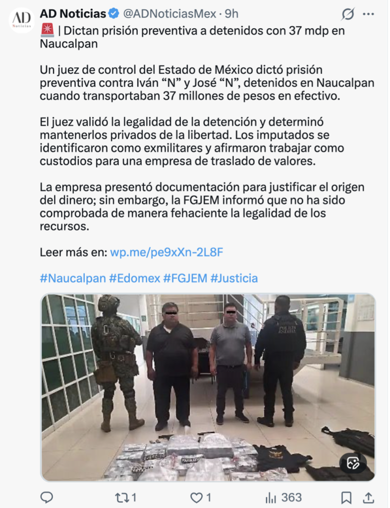 • https://www.eluniversaledomex.com.mx/seguridad/se-quedan-tras-las-rejas-prision-preventiva-para-los-detenidos-con-37-mdp-en-naucalpan/https://digitalmex.mx/seguridad/story/63897/aseguran-37-millones-en-naucalpan-investigados-enfrentan-audiencia