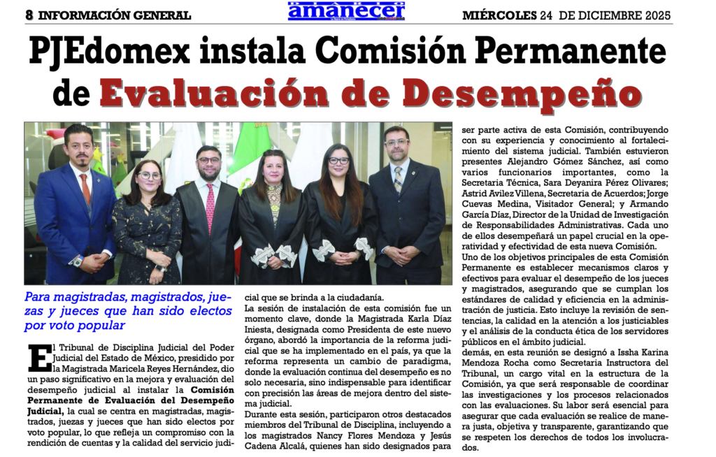 El Tribunal de Disciplina Judicial, presidido por la Magistrada Maricela Reyes Hernández, instaló la Comisión Permanente de Evaluación del Desempeño Judicial de Magistradas, Magistrados, Juezas y Jueces del #PJEdomex electos por voto popular.