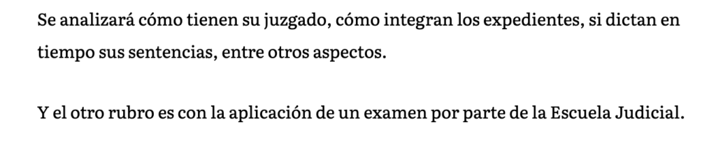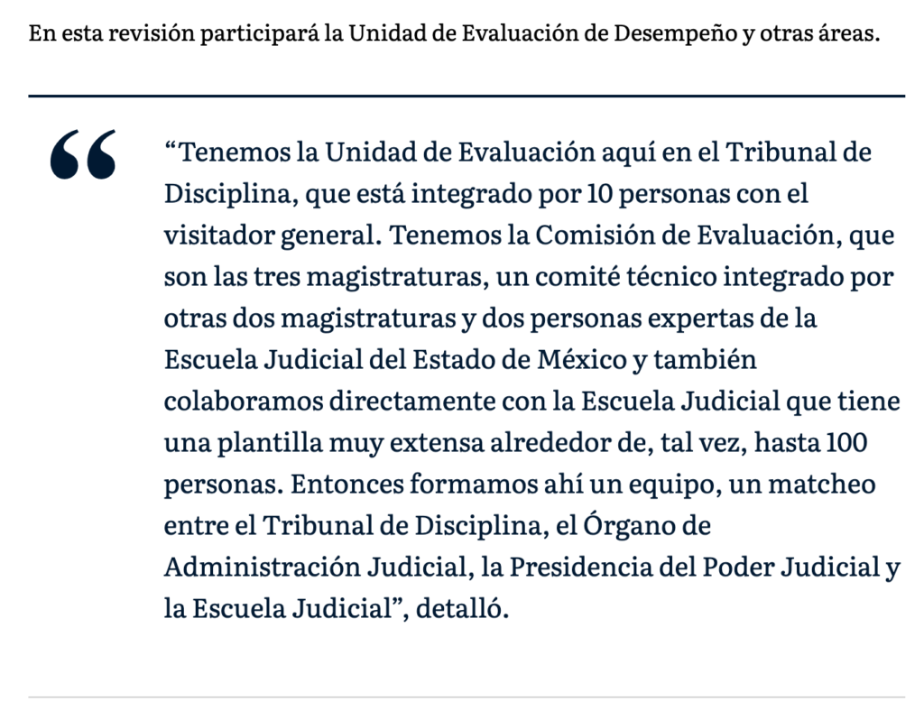 En entrevista con El Heraldo de México, el también integrante de este Tribunal, detalló que esta evaluación se realizará en dos rubros, uno es mediante la visita a los juzgados y tribunales para revisar seis indicadores: éticos, técnicos, de actuación, de profesionalización, de mejora continua y de desempeño judicial.