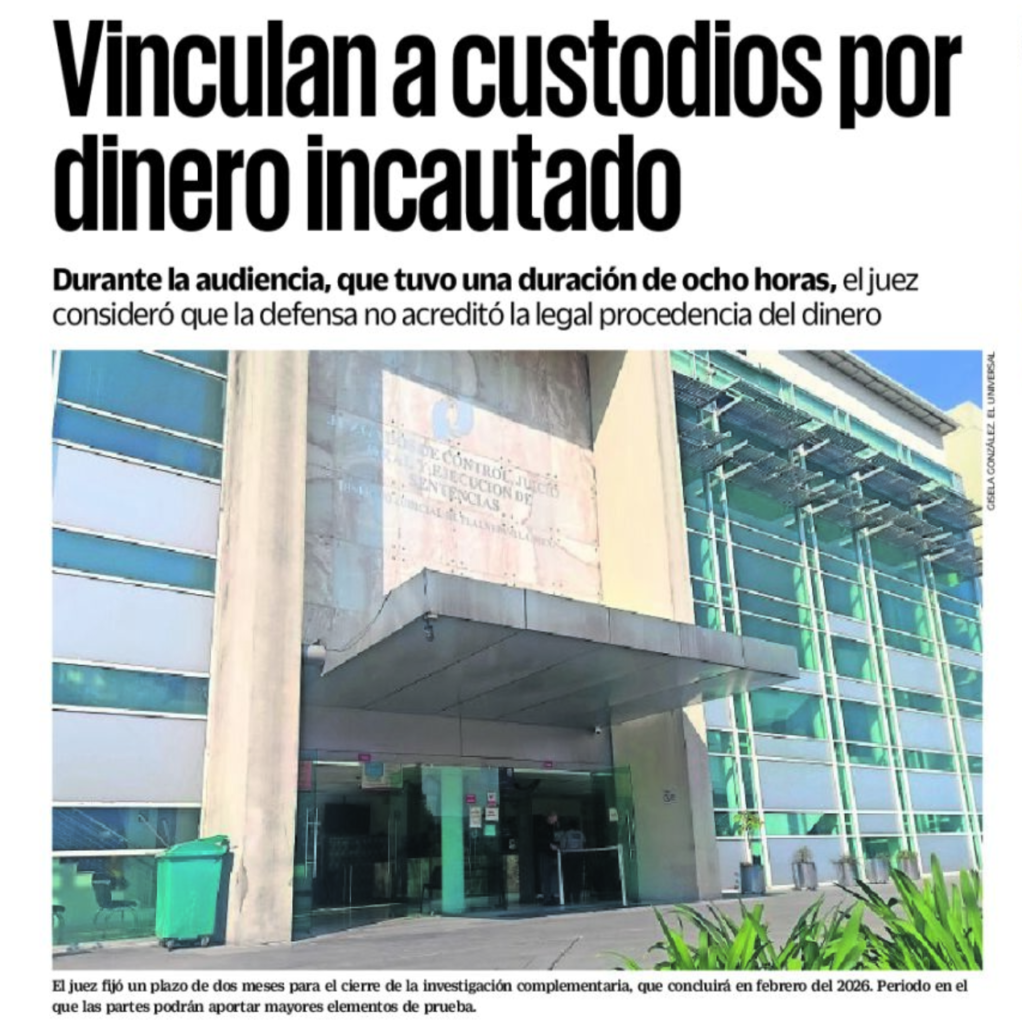 Un juez de control del Poder Judicial del Estado de México vinculó a proceso a Iván “N” y José “N”, custodios de la empresa Águila Bicéfala de Transporte, por no acreditar la procedencia legal de 37 millones de pesos que trasladaban en una camioneta blindada.