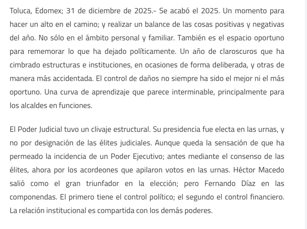 El Poder Judicial tuvo un clivaje estructural. Su presidencia fue electa en las urnas, y no por designación de las élites judiciales. Aunque queda la sensación de que ha permeado la incidencia de un Poder Ejecutivo; antes mediante el consenso de las élites, ahora por los acordeones que apilaron votos en las urnas. Héctor Macedo salió como el gran triunfador en la elección; pero Fernando Díaz en las componendas. El primero tiene el control político; el segundo el control financiero. La relación institucional es compartida con los demás poderes.