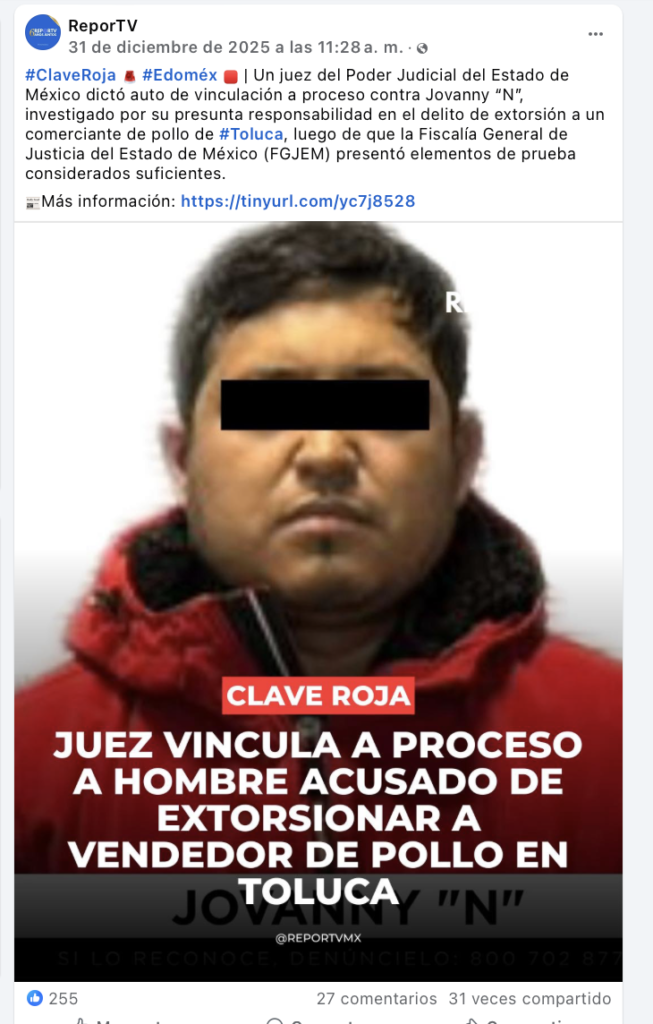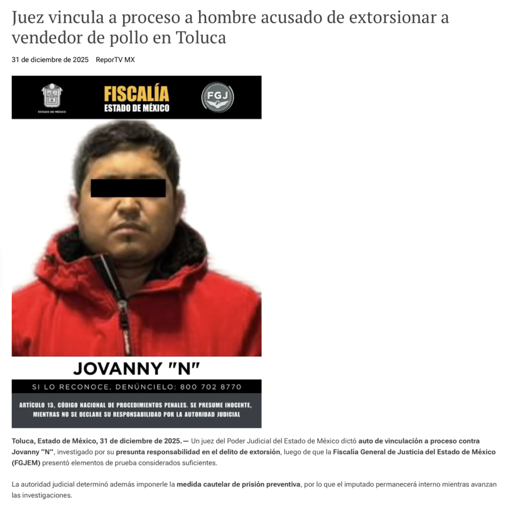 - https://reportv.com.mx/2025/12/31/juez-vincula-a-proceso-a-hombre-acusado-de-extorsionar-a-vendedor-de-pollo-en-toluca/?fbclid=IwY2xjawPEo1RleHRuA2FlbQIxMABicmlkETFDeTlwMnBBUERHdDJ3QjdRc3J0YwZhcHBfaWQQMjIyMDM5MTc4ODIwMDg5MgABHnyqCR7icCy_w5x_4iJ5Uz-zGro315nLOYhYfKDKzMhwaV4wAXXGmJgNWyVR_aem_TTfLyyVid0PHu7p-yr8ocQ