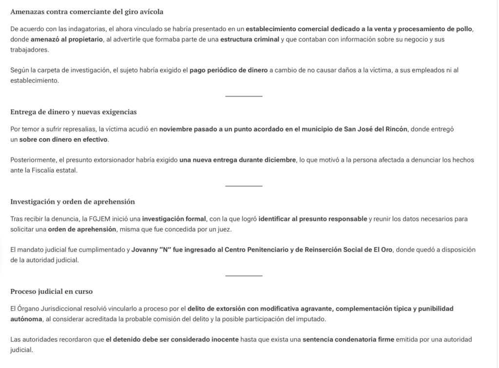 Un juez del Poder Judicial del Estado de México dictó auto de vinculación a proceso contra Jovanny “N”, investigado por su presunta responsabilidad en el delito de extorsión a un comerciante de pollo de #Toluca, luego de que la Fiscalía General de Justicia del Estado de México (FGJEM) presentó elementos de prueba considerados suficientes.