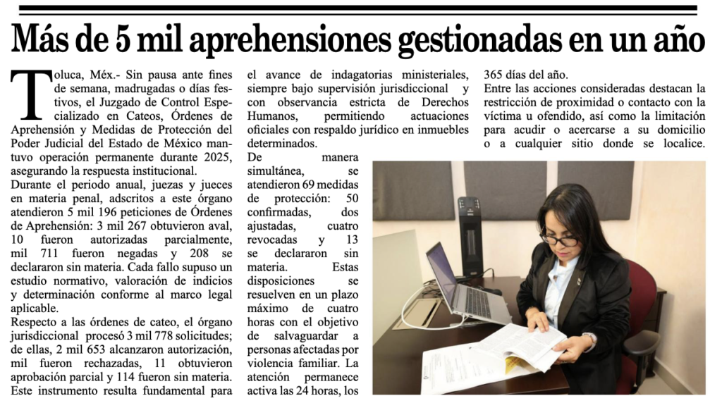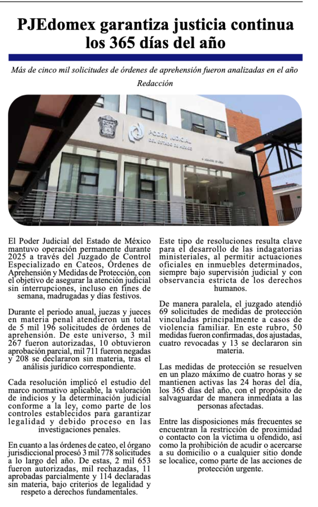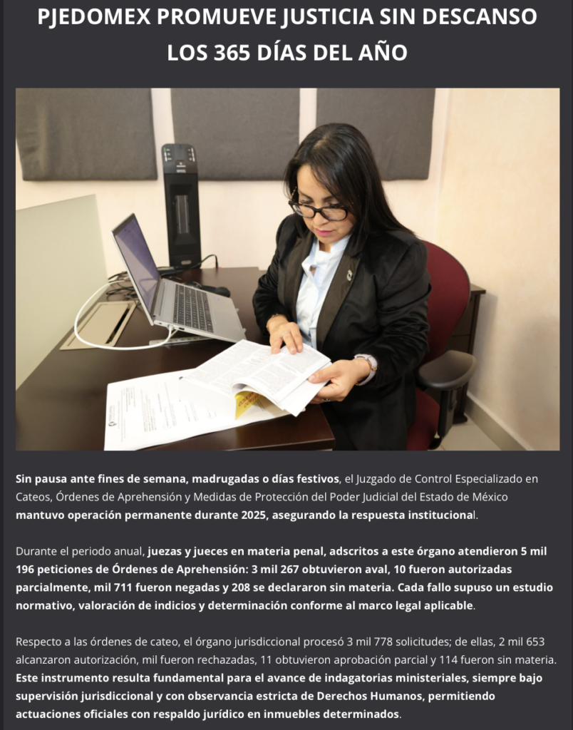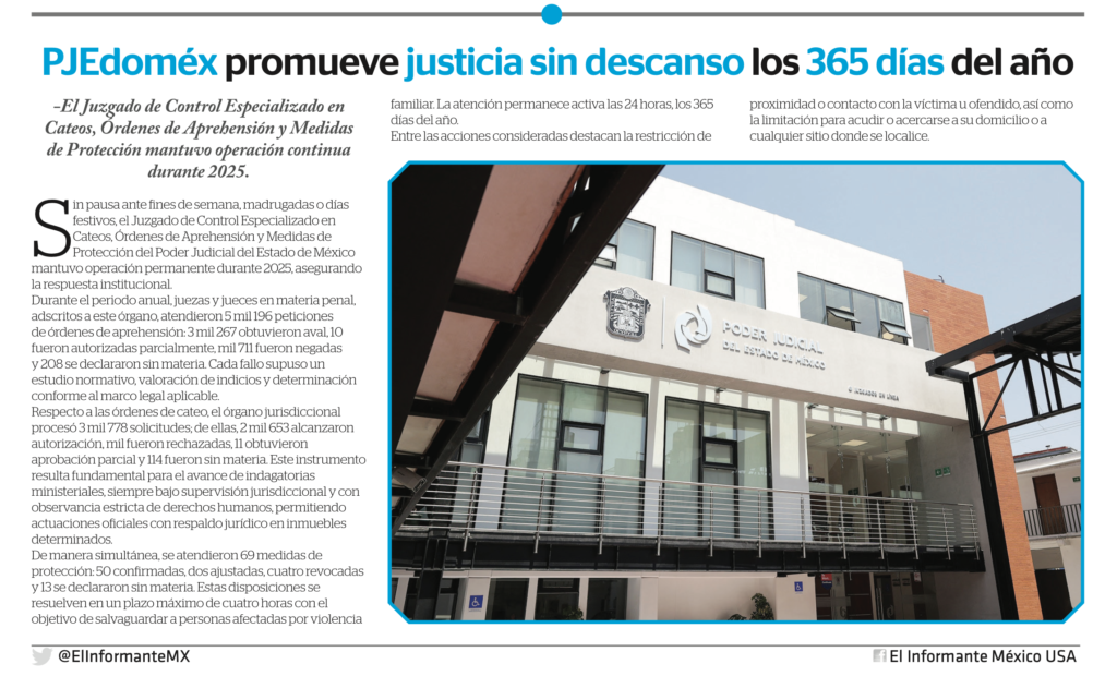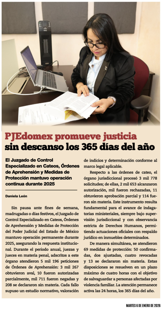 Sin pausa ante fines de semana, madrugadas o días festivos, el Juzgado de Control Especializado en Cateos, Órdenes de Aprehensión y Medidas de Protección del Poder Judicial del Estado de México mantuvo operación permanente durante 2025, asegurando la respuesta institucional.