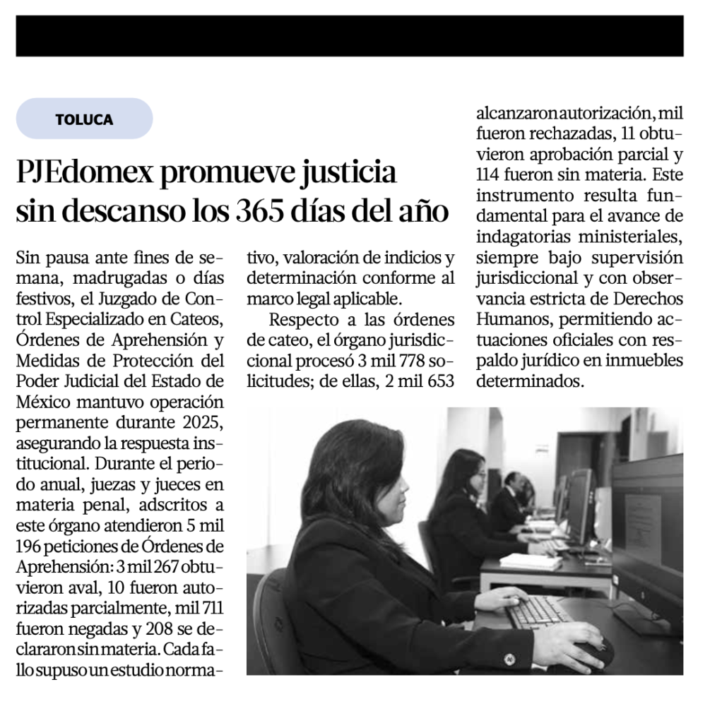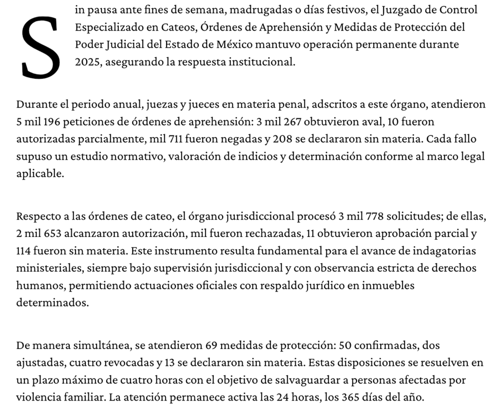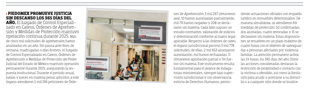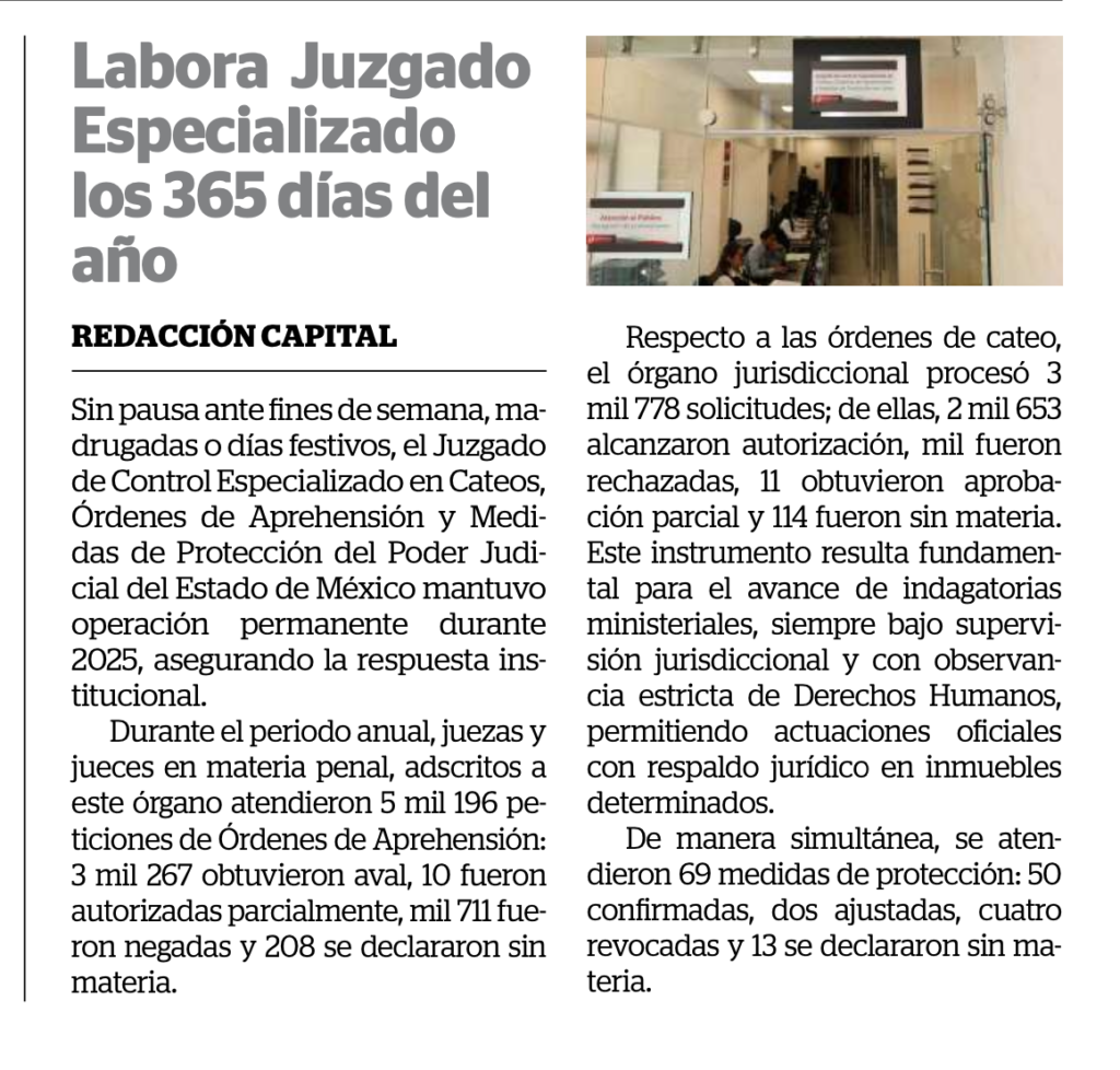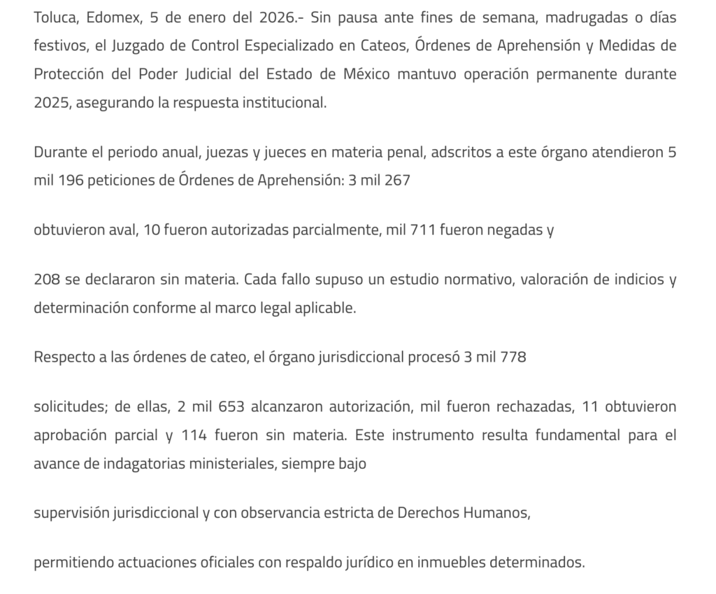Sin pausa ante fines de semana, madrugadas o días festivos, el Juzgado de Control Especializado en Cateos, Órdenes de Aprehensión y Medidas de Protección del Poder Judicial del Estado de México mantuvo operación permanente durante 2025, asegurando la respuesta institucional.