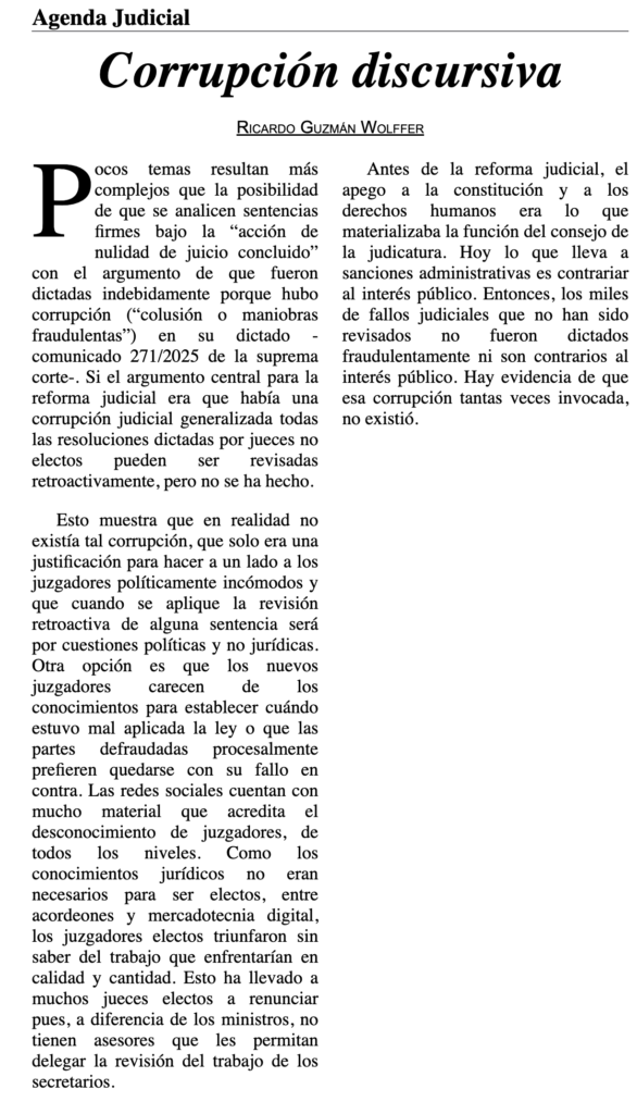 Pocos temas resultan más complejos que la posibilidad de que se analicen sentencias firmes bajo la “acción de nulidad de juicio concluido” con el argumento de que fueron dictadas indebidamente porque hubo corrupción (“colusión o maniobras fraudulentas”) en su dictado -comunicado 271/2025 de la suprema corte-. Si el argumento central para la reforma judicial era que había una corrupción judicial generalizada todas las resoluciones dictadas por jueces no electos pueden ser revisadas retroactivamente, pero no se ha hecho.