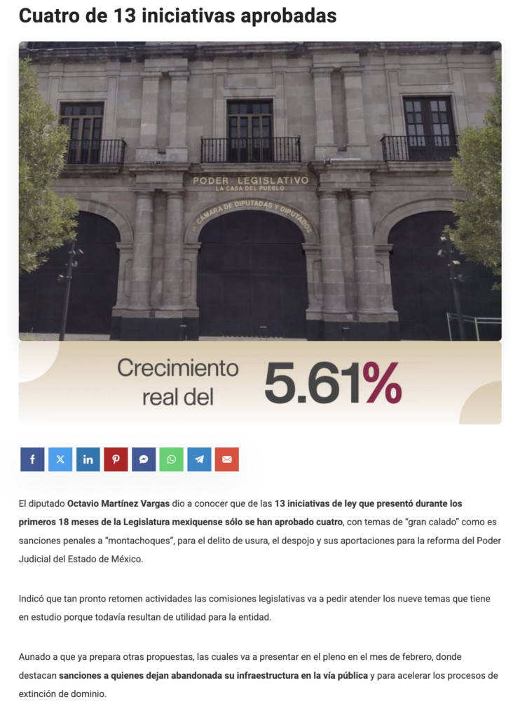El diputado Octavio Martínez Vargas dio a conocer que de las 13 iniciativas de ley que presentó durante los primeros 18 meses de la Legislatura mexiquense sólo se han aprobado cuatro, con temas de “gran calado”como es sanciones penales a “montachoques”, para el delito de usura, el despojo y sus aportaciones para la reforma del Poder Judicial del Estado de México.